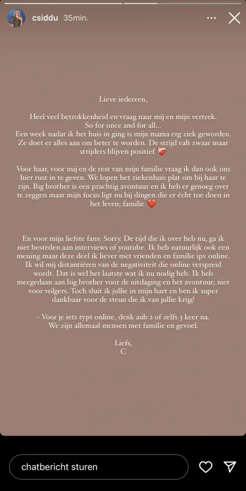 “Ze doet er alles aan om beter te worden. De strijd valt zwaar, maar strijders blijven positief”, aldus Chiara. Nu ze de echte reden van haar vertrek heeft verklapt, wil ze dan ook met rust gelaten worden. “We lopen het ziekenhuis plat om bij haar te zijn. ‘Big Brother’ is een prachtig avontuur en ik heb er genoeg over te zeggen, maar mijn focus ligt nu bij dingen die er écht toe doen in het leven: familie”, klinkt het.
