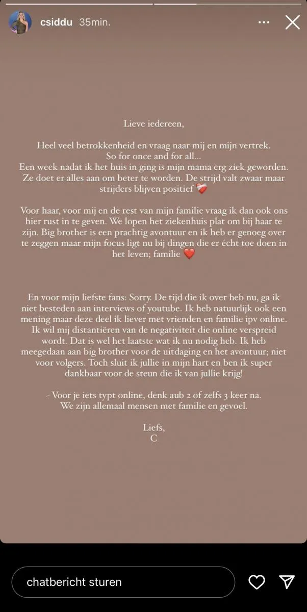 Vervolgens heeft ze ook nog een duidelijke boodschap voor haar fans. “Sorry. De tijd die ik over heb nu, ga ik niet besteden aan interviews of YouTube”, onderstreept ze. Daarnaast wil ze zich ook distantiëren van de negativiteit die online verspreid wordt over het programma en de kandidaten. “Ik heb meegedaan aan ‘Big Brother’ voor de uitdaging en het avontuur, niet voor volgers. Toch sluit ik jullie in mijn hart en ben ik superdankbaar voor de steun die ik van jullie krijg”, besluit ze.