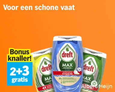'2+3'-actie. Koop je drie flessen van bijvoorbeeld 'Dreft Afwasmiddel max power original', dan betaal je slechts 6,68 euro.