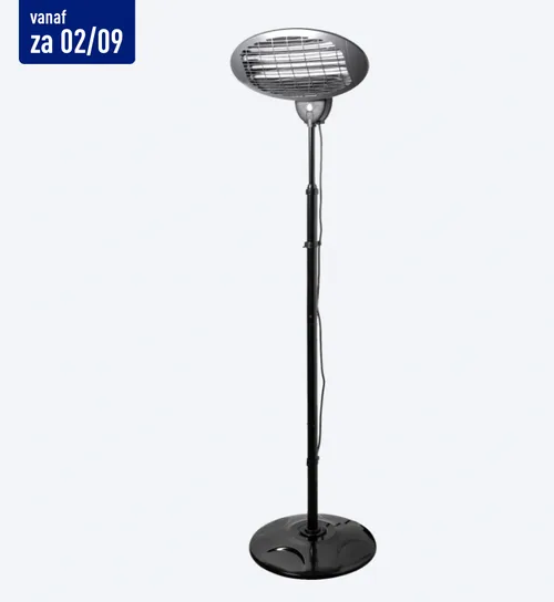 terrasverwarmer van het merk Quigg. De terrasverwarmer, die 210 x 49 x 49 cm meet, heeft een vermogen van 2000 watt en een stralingsbereik van 16 m².