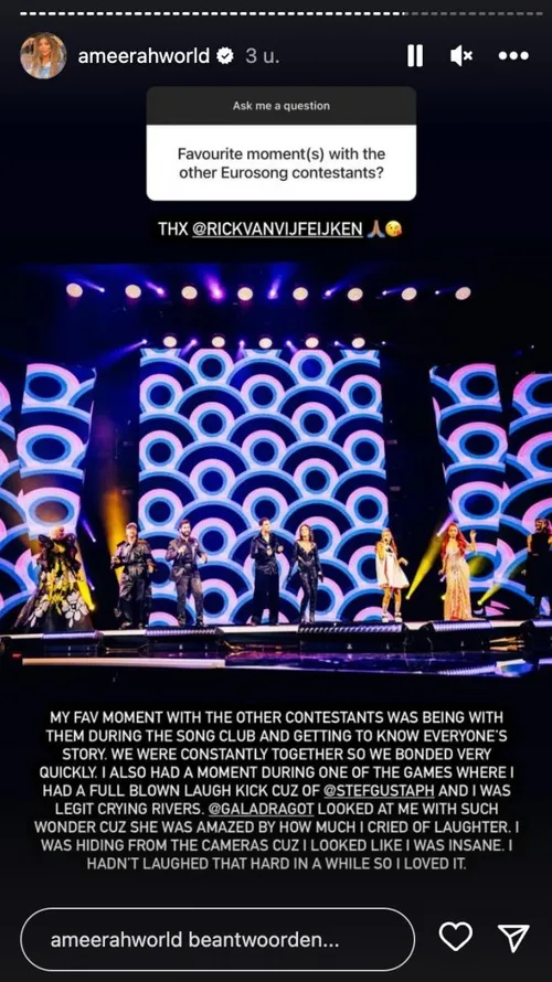 Op Instagram wordt gevraagd naar Ameerahs leukste moment met haar medekandidaten. “Mijn favoriete moment met de andere deelnemers was bij hen zijn tijdens de songclub en ieders verhaal leren kennen”, antwoordt de zangeres. “We waren constant samen dus we hadden al snel een hele goede band.” Bovendien werd er heel wat afgelachen achter de schermen.