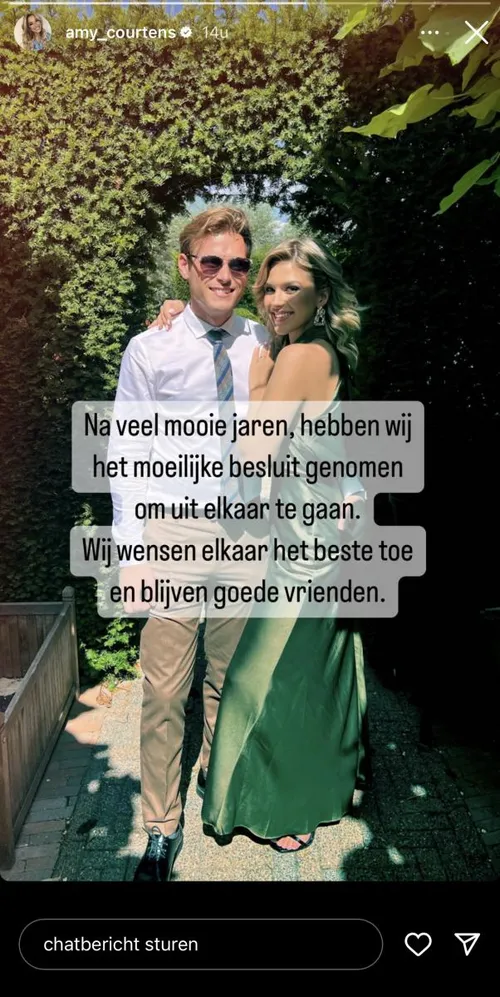 “Na veel mooie jaren hebben wij het moeilijke besluit genomen om uit elkaar te gaan”, schreef de blondine. Niet alleen hadden ze zich al verloofd, ze waren ook een huis aan het bouwen in Wolfsdonk. De liefde is dus bekoeld, maar ze verduidelijkt dat er geen ruzie is. “Wij wensen elkaar het beste toe en blijven goede vrienden”, aldus Amy.