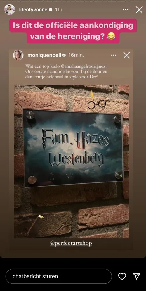 Echter lijkt Monique nu te bevestigen dat de twee al even terug samen wonen. Betekent dat ook dat ze terug samen zijn? Ze deelt namelijk een opmerkelijke foto waarop “Familie Hazes-Westenberg” staat. “Ons eerste naambordje voor bij de deur en dan eentje helemaal in style voor Dré!”, aldus Monique. “Is dit de officiële aankondiging van de hereniging?”, vraagt Yvonne zich af.