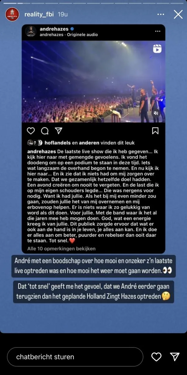 André blikt op zijn Instagrampagina terug op zijn laatste show die hij heeft gegeven. Hij plaatst daar een video van en laat ook weten hoe hij zich daarbij voelt. Zo geeft hij aan dat hij het mist om op een podium te staan. “Dat ‘tot snel’ geeft me het gevoel dat we André eerder gaan terugzien dan het geplande ‘Holland Zingt Hazes’-optreden”, schrijft juicekanaal ‘Reality_FBI’.