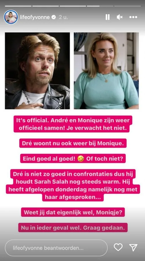 “Het is officieel. André en Monique zijn weer samen. Je verwacht het niet”, laat Yvonne weten op haar juicekanaal. Eerder wist ze al te vertellen dat André het opnieuw wou proberen met zijn ex. Ze gingen onlangs samen naar Disneyland met hun zoontje. Sindsdien is het dik aan en werd zijn auto al meermaals voor Moniques huis gespot. “Dré woont nu ook weer bij Monique”, weet Yvonne.