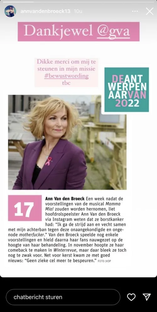 Afgelopen zomer kwam het nieuws naar buiten dat Ann Van den Broeck borstkanker had. Sindsdien geeft ze haar volgers geregeld een update over haar strijd en dat wordt duidelijk geapprecieerd. Van Gazet van Antwerpen krijgt Ann nu zelfs de zeventiende plaats op de ranglijst van ‘De Antwerpenaar van 2022’. “Dankjewel Gazet van Antwerpen”, schrijft ze trots op haar Instagramverhaal.
