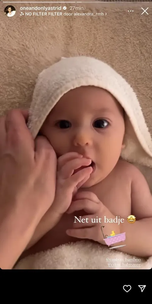Niet veel later laat de mama nog een prachtige foto zien van haar jongste oogappeltje. “Net uit badje”, aldus Astrid. Op het kiekje krijgen we Joey-Lee te zien met een handdoek op haar hoofd. Met haar grote, schattige oogjes doet ze alle volgers van Astrid helemaal smelten.