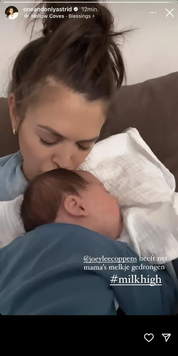 Op haar Instagramverhaal plaatst ze een filmpje waarin we Joey-Lee zien slapen op de borst van haar mama. Ze heeft net borstvoeding gekregen en is nu aan het genieten van een dutje. “Joey-Lee heeft net mama’s melkje gedronken”, schrijft Astrid erbij. Ze noemt haar slaapje zelfs een ‘milk high’.