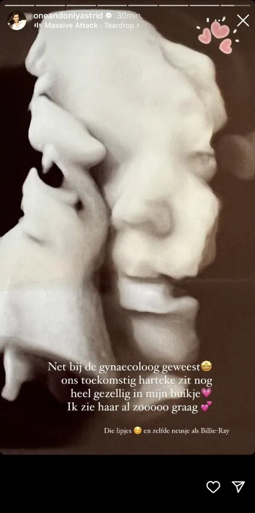 Zo plaatst Astrid een prachtig echobeeld op haar Instagramverhaal. Op het plaatje krijgen we een eerste glimp van het gezichtje van haar ongeboren dochtertje te zien. “Net bij de gynaecoloog geweest. Ons toekomstig ‘harteke’ zit nog heel gezellig in mijn buikje”, schrijft ze erbij. “Ik zie haar al zooooo graag”, aldus Astrid.