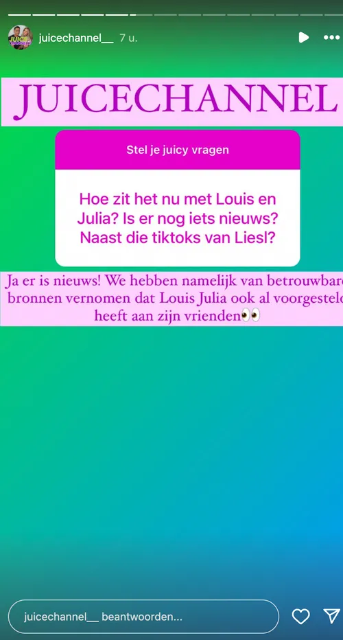 Intussen zou het voorbij zijn tussen Louis en zijn vriendin Liesl en heeft hij zijn hart helemaal aan Julia verloren. Volgens Juice Channel zou Louis Julia immers al voorgesteld hebben aan zijn vrienden. Het medium meldt dat op basis van "betrouwbare bronnen".
