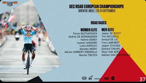 Lotte Kopecky wordt bijgestaan door Fauve Bastiaenssen, Valerie Demey, Audrey De Keersmaeker, Justine Ghekiere, Marieke Meert, Marion Norbert-Riberolle en Marthe Truyen. Net als bij de mannen is het de ambitie om de wedstrijd te winnen. Mocht het Kopecky lukken om de trui te veroveren, dan is ze tegelijk Belgisch, Europees én wereldkampioene. Ongezien.