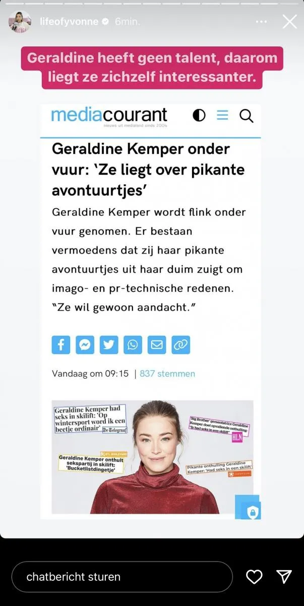 “Dat is wel heel knap”, lacht de Privé-baas. “Ik geloof er geen ene reet van. Wat een malle meid is dat toch eigenlijk. Die heeft altijd van die rare verhalen”, besluit Evert. Ook Yvonne Coldeweijer moet hier wat over kwijt. “Geraldine heeft geen talent, daarom liegt ze zichzelf interessanter”, schrijft de roddeltante op haar Instagramverhaal.