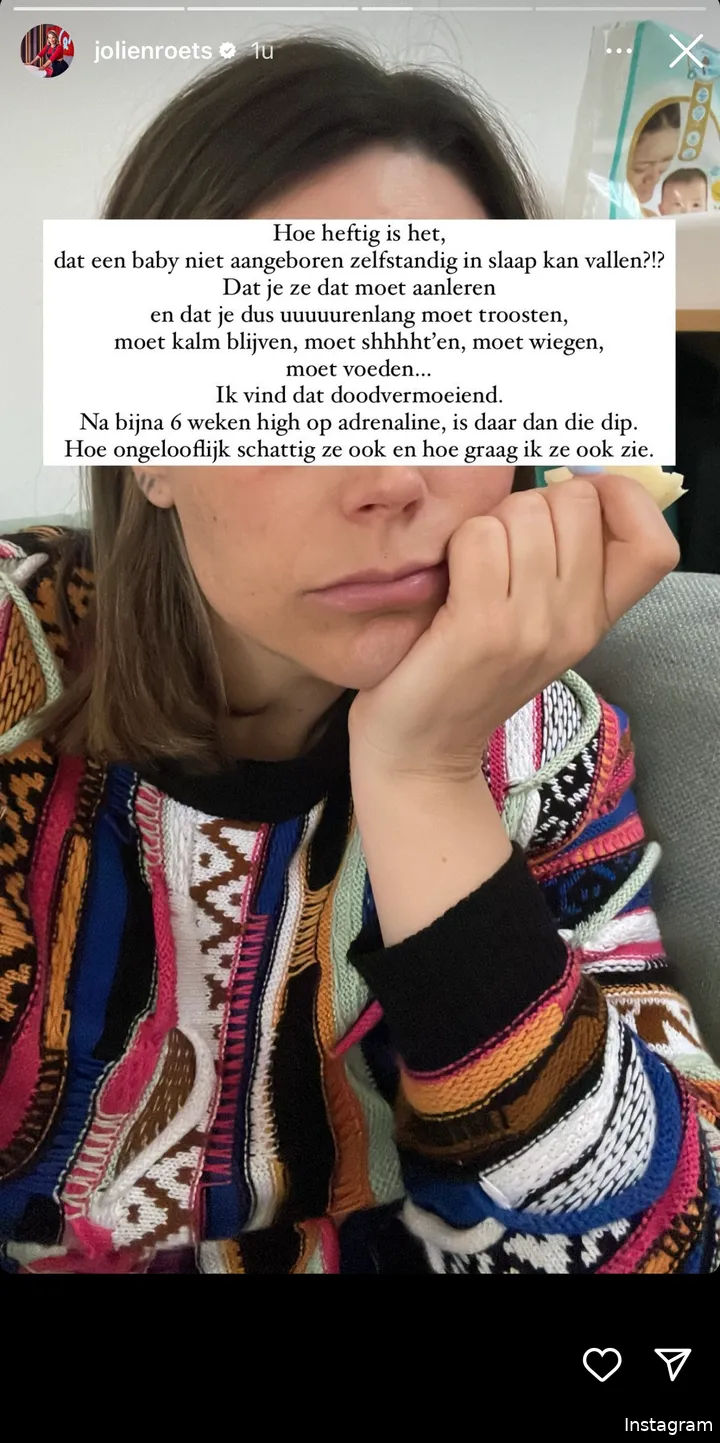 “Hoe heftig is het dat een baby niet aangeboren zelfstandig in slaap kan vallen? Dat je ze dat moet aanleren en dat je dus urenlang moet troosten, moet kalm blijven, moet shhht’en, moet wiegen, moet voeden…”, aldus de radiopresentatrice. “Ik vind dat doodvermoeiend”, geeft ze eerlijk toe. “Na bijna zes weken high op adrenaline, is daar dan die dip”, besluit ze.