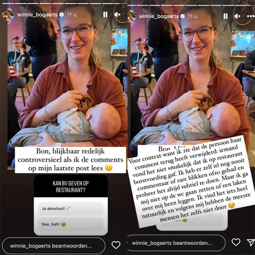 De kersverse mama kon helaas niet van iedereen evenveel steun verwachten. De haatcomments zijn intussen verwijderd, maar Winnie frist het nog even op voor ons. “Iemand vond het niet smakelijk dat ik op restaurant borstvoeding gaf”, schrijft ze verontwaardigd op haar Instagramverhaal. “Maar ik heb er zelf in real life nog nooit commentaar op gehad of rare blikken gekregen”, vuurt Winnie terug.