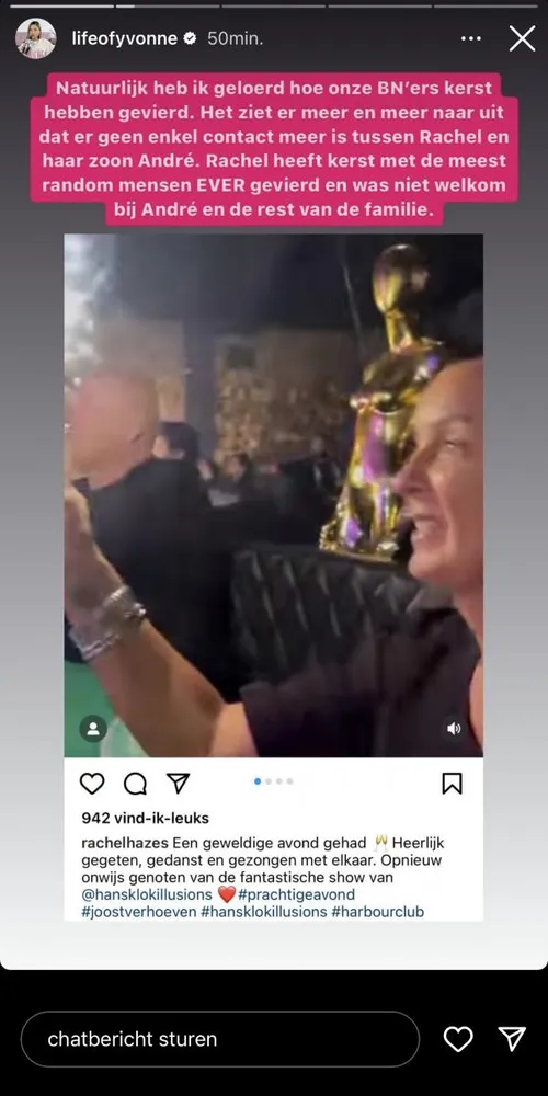 Yvonne Coldeweijer moet daar wat over kwijt op haar Instagramverhaal. “Het ziet er meer en meer naar uit dat er geen enkel contact meer is tussen Rachel en haar zoon André”, stelt ze vast. “Rachel heeft kerst met de meest