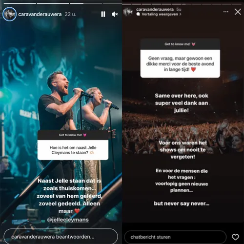 Tijdens een vragenronde op Instagram bedankt een fan Cara voor “de beste avond in lange tijd”. “Hier hetzelfde, superveel dank aan jullie! Voor ons waren het shows om nooit te vergeten”, schrijft Cara terug. Hoe kan het ook anders naast zulke fantastische collega’s? “Naast Jelle staan, dat is zoals thuiskomen”, vindt de zangeres. “Zoveel van hem geleerd, zoveel gedeeld. Alleen maar liefde!”