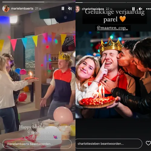 Maarten mocht eergisteren namelijk 23 kaarsjes uitblazen en speciaal voor zijn verjaardag werd de acteur - tot zijn grote verrassing - achter de schermen bij ‘Familie’ stevig in de bloemetjes gezet. Dat omvat: een taart, een kroon, een luid applaus en een klein feestje. Onder anderen Aaron Blommaert (Raven),
