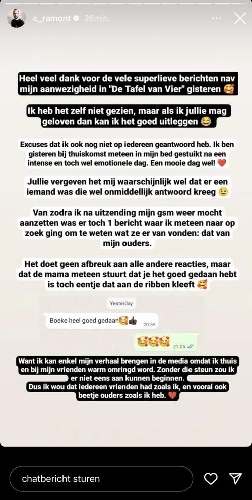 Na de uitzending kreeg Christophe bijzonder veel lieve berichtjes binnen. Veel mensen vinden het namelijk erg moedig dat hij zo openlijk durft te praten over zijn diagnose. Hij heeft nog niet de tijd gehad om op iedereen te reageren, maar zijn ouders kregen al wel een reactie van hun zoon. “Er was toch een bericht waar ik meteen naar op zoek ging om te weten wat ze er van vonden: dat van mijn ouders”, schrijft hij op Instagram.