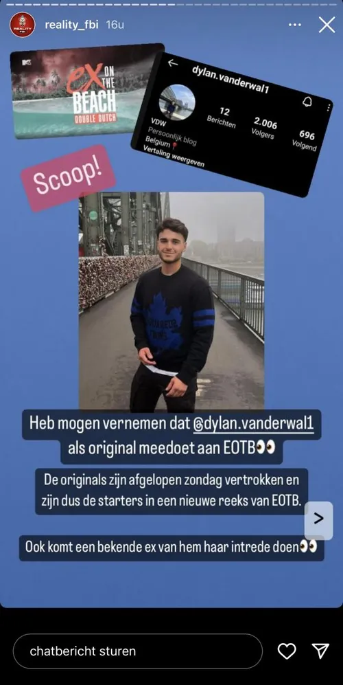 Reality_fbi kondigt op Instagram aan dat het juicekanaal een primeur beet heeft over het MTV-programma. De originals zouden afgelopen zondag vertrokken zijn naar een nog onbekende bestemming en er is ook al meer bekend over een van de kandidaten. “Heb mogen vernemen dat Dylan Vanderwal als original meedoet aan EOTB”, klinkt het.