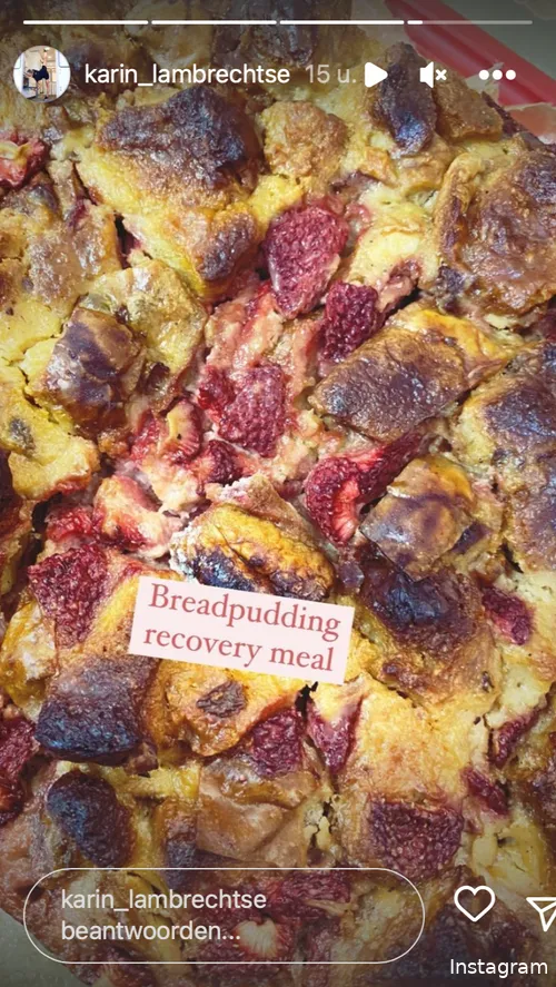 Daar liet ze zien wat ze doorheen haar dag zoal moet doen. Samen met chef Remco Henkes zorgt ze dat er na de koers een buffet klaarstaat voor de renners. En niets minder dan… broodpudding - uitgevonden in Brussel - blijkt de ideale herstelmaaltijd te zijn!