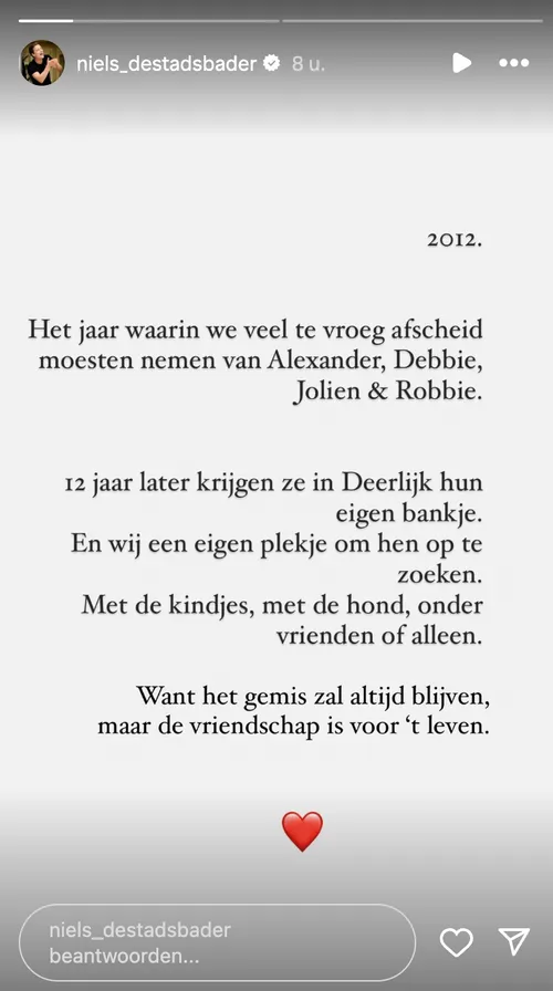 "Twaalf jaar later krijgen ze in Deerlijk hun eigen bankje. En wij een eigen plek om hen op te zoeken. Met de kindjes, met de hond, onder vrienden of alleen", deelt Niels op Instagram.