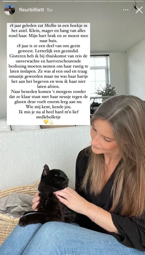 In haar privéleven zit het momenteel ook niet mee voor Fleur. Ze heeft namelijk moeten afscheid nemen van haar kat. "Wie mij kent, kende jou", schrijft ze erbij. Ze adopteerde Mollie uit het asiel en werd 18 jaar. "Haar hartje was het aan het begeven en ik wou haar niet laten afzien", aldus Fleur.