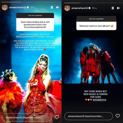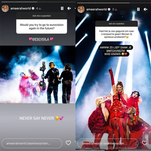 Nieuwe muziek is dus onderweg, of misschien zelfs een album. “Ik weet nog niet wanneer, maar er komt alleszins nieuwe muziek aan”, kan ze al verklappen. Bovendien sluit Ameerah een toekomstige deelname aan het Songfestival niet uit. Probeert ze het binnen twee jaar opnieuw? “Wie weet?” en “Zeg nooit nooit”, sluit de zangeres de vragenronde af.