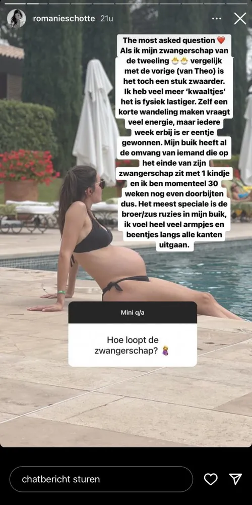 Op Instagram krijgt ze nu de vraag hoe de zwangerschap loopt. Dan onthult Romanie enkele moeilijkheden. “Als ik mijn zwangerschap van de tweeling vergelijk met de vorige is het toch een stuk zwaarder”, bekent ze. “Ik heb veel meer ‘kwaaltjes’ en het is fysiek lastiger”, legt ze uit. “Zelf een korte wandeling maken vraagt veel energie.”