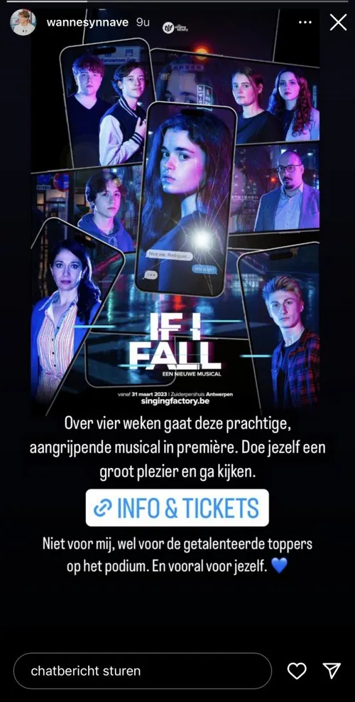 Zo promoot hij de nieuwe musical ‘If I Fall’ waaraan hij heeft meegewerkt. “Over vier weken gaat deze prachtige aangrijpende musical in première”, schrijft Wanne op zijn Instagramverhaal. “Doe jezelf een groot plezier en ga kijken. Niet voor mij, wel voor de getalenteerde toppers op het podium. En vooral voor jezelf”, klinkt het.