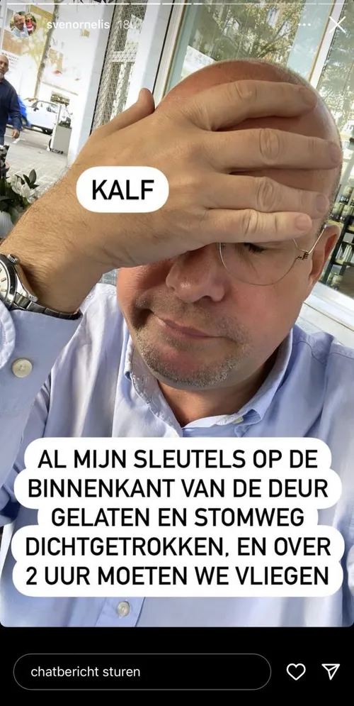 Sven legt op zijn Instagramverhaal uit wat er juist gebeurd is. “Kalf”, begint de radiopresentator aan zijn bekentenis. “Al mijn sleutels op de binnenkant van de deur gelaten en stomweg dichtgetrokken, en over twee uur moeten we vliegen”, aldus een gestresseerde Sven die bang is om zijn vlucht te missen.