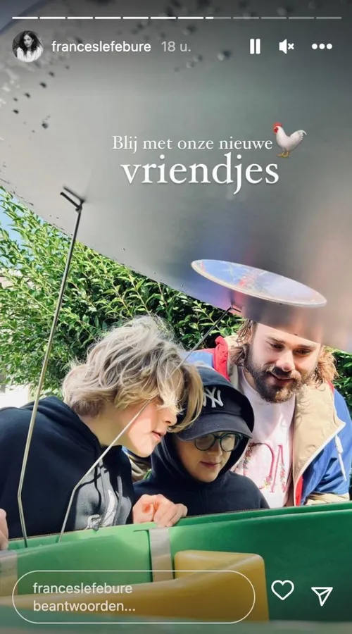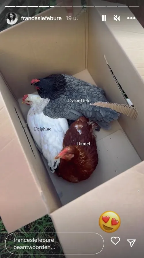 Niet één, maar drie nieuwe leden telt het gezin van Frances en Boris. Het koppel heeft namelijk drie kippen in huis genomen. De beestjes luisteren naar de ludieke namen Delphine, Daniel en Dylan-Dirk. "Blij met onze nieuwe vriendjes", schrijft Frances.