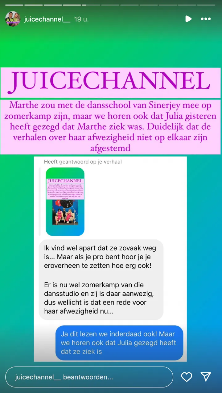 Ditmaal zou het zijn omdat ze weg is met de dansschool van haar man Sinerjey Meyfroodt. Dat zou een geldige reden zijn, maar Juice Channel trekt dit toch in twijfel. Julia Boschman zou namelijk gezegd hebben dat Marthe ziek was.