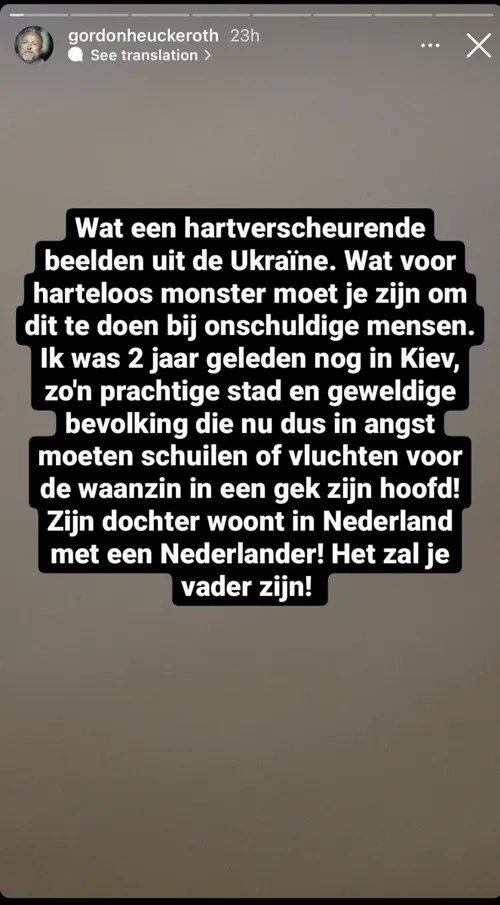 Gordon verwijst hiermee naar de Russische president Poetin. “Wat voor harteloos monster moet je zijn om dit te doen bij onschuldige mensen. Zijn dochter woont in Nederland met een Nederlander! Het zal je vader zijn!"