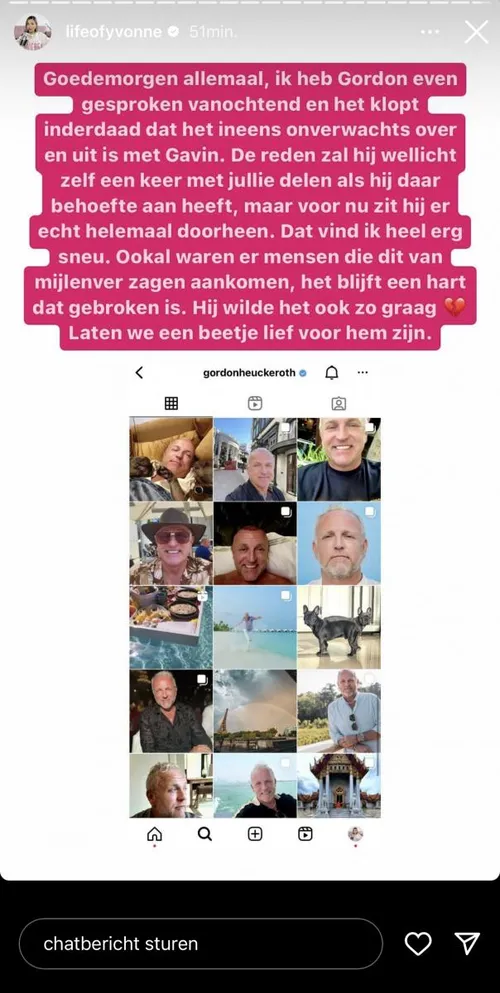 Helaas zal er geen huwelijk meer komen volgens Evert Santegoeds. Dat vertelde de showjournalist aan De Telegraaf. De krant kon Gordon niet bereiken, maar Yvonne Coldeweijer kon hem wel even spreken. “Het klopt inderdaad dat het ineens onverwachts over en uit is met Gavin”, aldus de juicekoningin.