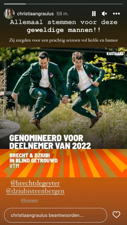 De ‘Kastaars!’ zijn de gloednieuwe prestigieuze Vlaamse mediaprijzen van VRT, VTM en Play4. De awards worden op zaterdag 28 januari uitgereikt. “Allemaal stemmen voor deze geweldige mannen”, roept ‘Blind Getrouwd’-mededeelnemer Christiaan zijn Instagramvolgers op. “Zij zorgden voor een seizoen vol liefde en humor”, besluit hij.