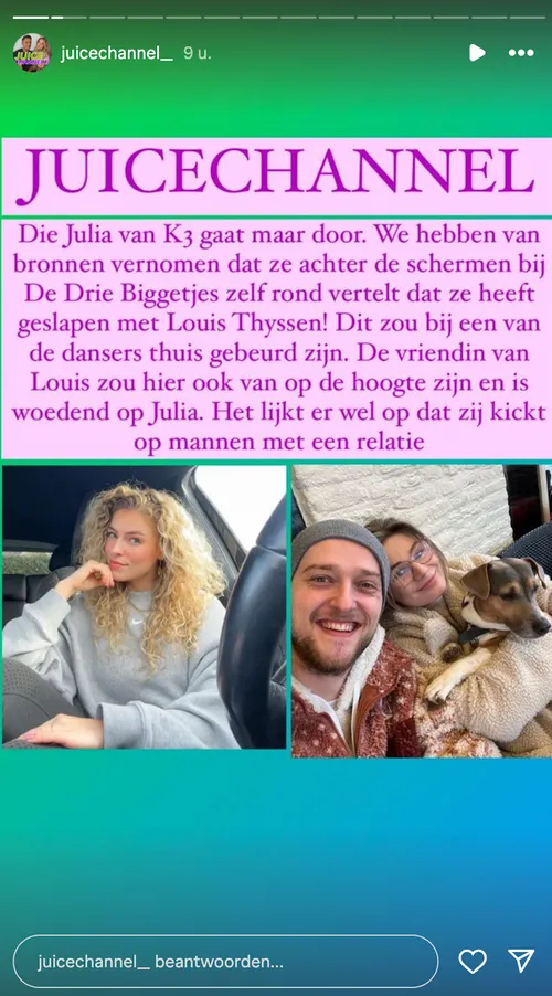 Julia Boschman. Althans, Juice Channel lanceert die verhalen. Zo zou Julia weer een avontuur gehad hebben met een Bekende Vlaming.