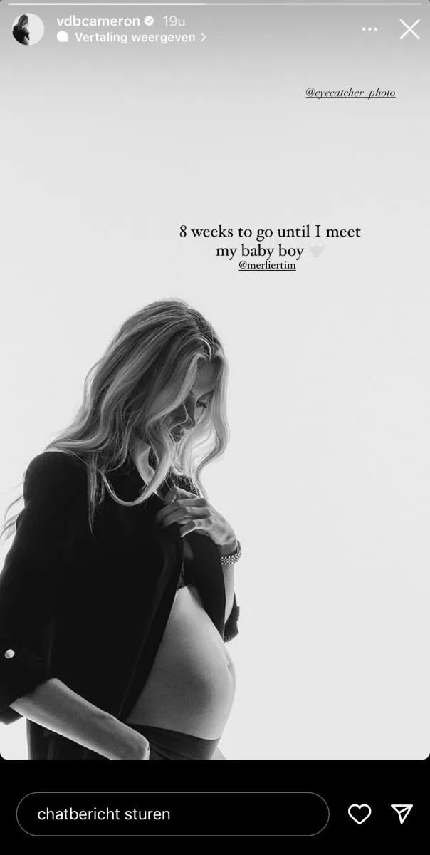 “Nog acht weken te gaan tot ik mijn kleine jongen ontmoet”, schrijft Cameron op haar Instagramverhaal. Ze deelt een mooie zwart-witfoto waarop ze haar bolle buik in de kijker zet. Ook op haar Instagrampagina plaatst ze nog een plaatje waarop ze te zien is in lingerie. “8 maanden wij”, aldus de toekomstige mama.