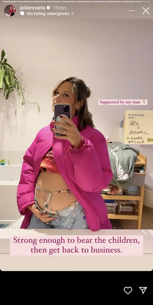 Het aftellen kan nu echt beginnen en op haar Instagramverhaal pronkt de radiopresentatrice nu nog maar eens met haar bolle buik. Zo deelt ze een kiekje waarop ze voor de spiegel poseert in haar badkamer. “Sterk genoeg om de kinderen te baren en dan back to business”, schrijft Jolien erbij.