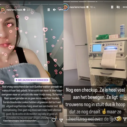 “Ik ben blij dat ik naar hier ben gekomen, maar ik zie zo hard af”, wil ze er nog over kwijt. Gelukkig stelt de baby het een pak beter dan haar moeder. “Op de echo en de monitor zag de baby er goed uit”, stelt Nasrien haar volgers gerust. “Ze is heel veel aan het bewegen.”
