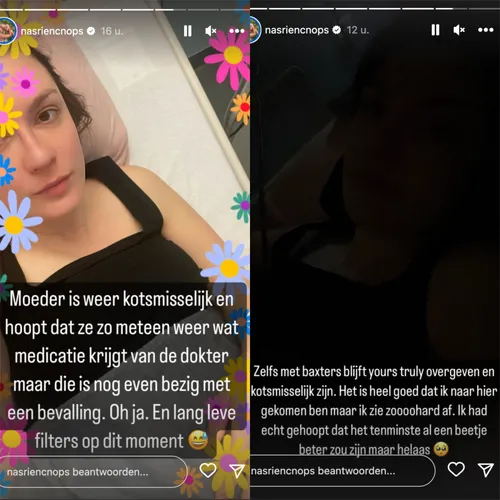 “We zijn naar spoed gereden en ze nu gaan ze me even hier houden”, klinkt het. Uit het eerste onderzoek bleek dat Nasrien uitgedroogd is. “Dus ik hang alvast aan een baxter met zoutoplossing.” Helaas was ze enkele uren later nog steeds even misselijk. “Zelfs met baxters blijf ik overgeven en kotsmisselijk zijn. Ik had echt gehoopt dat het al een beetje beter zou zijn, maar helaas”, vervolgt de radiopresentatrice.