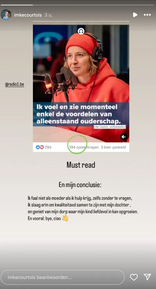 Het zijn maar enkele van de reacties. Imke heeft intussen gereageerd via haar Instagram Stories. "Mijn conclusie: Ik faal niet als moeder als ik hulp krijg, zelfs zonder te vragen. Ik slaag erin om kwaliteitsvol samen te zijn met mijn dochter, en geniet van mijn dorp waar mijn kind liefdevol kan oproepen. En vooral bye, ciao!"