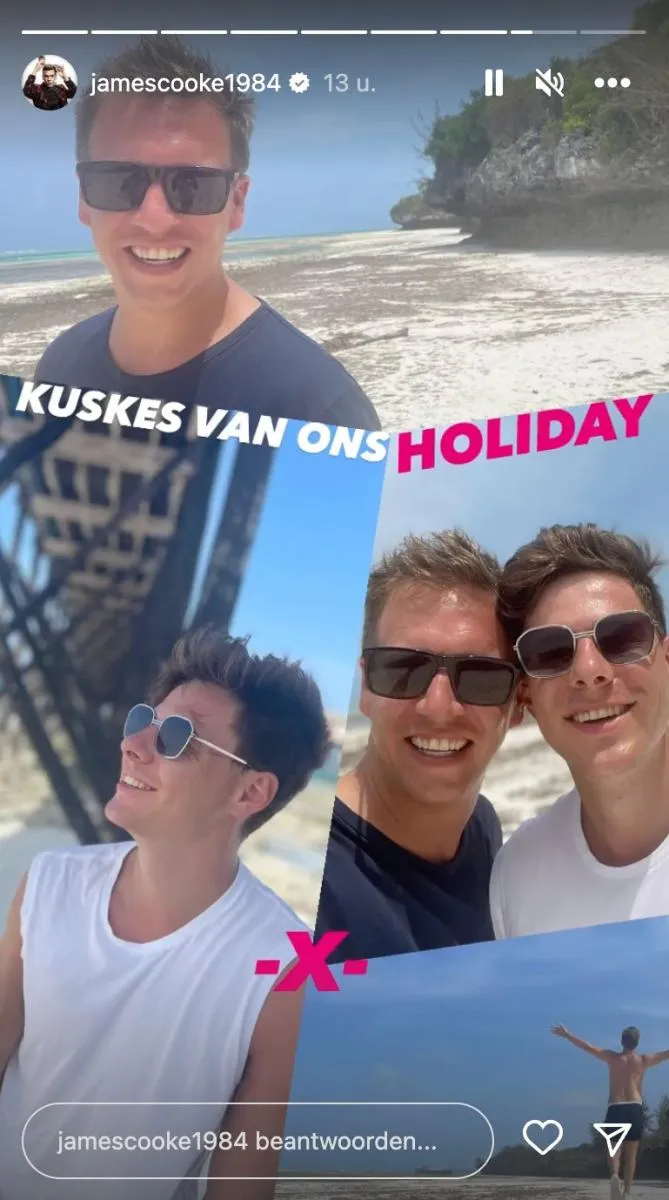 Ze trokken naar zonnigere oorden en hebben er de tijd van hun leven. James' volgers wensen hem dan ook alle plezier van de wereld toe. “Geniet ervan, schatjes”, schrijven zowel Christoff als Dina Tersago in de reacties. “Jongens, geniet, profiteer, make memories”, wenst Astrid Stokman hen toe. Maar ook Kelly Pfaff, Ruth Beeckmans en Bart Kaëll reageren dolenthousiast.