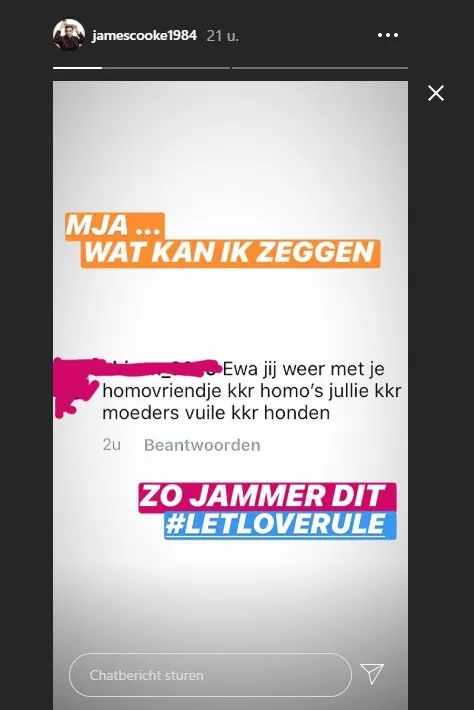 Homohaat is duidelijk de wereld nog niet uit. James Cooke deelde op zijn Instagram Stories een reactie van een volger op een foto van hem en zijn verloofde Dorian Liveyns. \"Tj