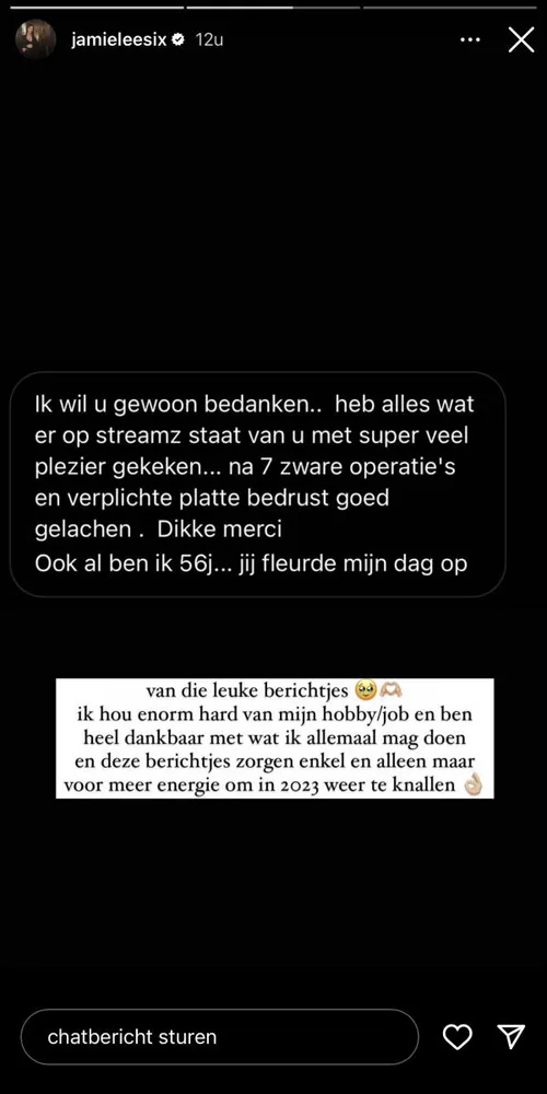 “Heb alles wat er op Streamz staat van jou met superveel plezier gekeken”, gaat haar volger verder. “Na zeven zware operaties en verplichte platte bedrust heb ik goed gelachen. Dikke merci. Ook al ben ik 56 jaar oud, jij fleurde mijn dag op”, aldus de fan. Een boodschap die duidelijk deugd doet bij Jamie-Lee.