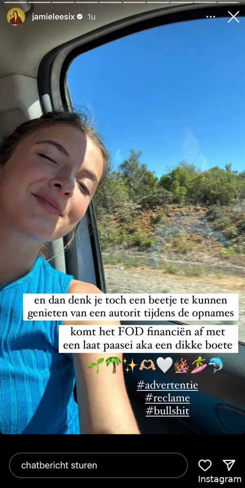 Op haar Instagramverhaal legt ze uit wat er aan de hand is. “En dan denk je toch een beetje te kunnen genieten van een autorit tijdens de opnames, komt het FOD Financiën af met een laat paasei a.k.a. een dikke boete”, schrijft een gefrustreerde Jamie-Lee. “Bullshit”, voegt ze er nog aan toe.