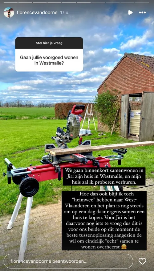 In een Q&A op Instagram verklapt Florence dat zij en Jiri gaan samenwonen. "We gaan binnenkort samenwonen in Jiri zijn huis in Westmalle en mijn huis zal ik proberen te verhuren", legt Florence uit.