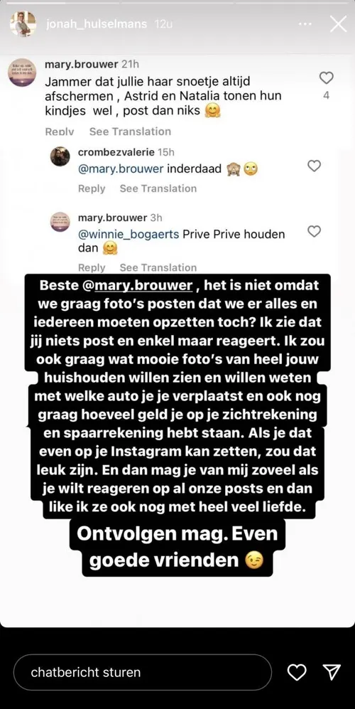 “Jammer dat jullie haar snoetje altijd afschermen. Astrid Coppens en Natalia tonen hun kindjes wel. Post dan niks”, klinkt het. Jonah pikt dat niet en geeft meteen een duidelijk antwoord. “Het is niet omdat we graag foto’s posten dat we er alles en iedereen moeten opzetten toch?”, schrijft hij. “Ontvolgen mag, even goede vrienden”, voegt hij er nog aan toe.