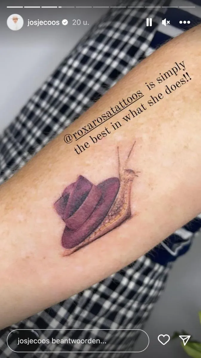 Het is een slak met - in plaats van een slakkenhuis - een grote rode hoed op zijn rug. En dat is duidelijk een knipoog naar Josjes nieuwste project, namelijk haar hoedenmerk. Haar bijzondere tattoo is ontworpen door Roxanne Rosa. “De beste in haar vak”, vindt de blondine.