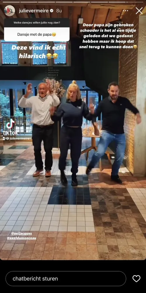 Julie Vermeire toonde gisteren enkele dansjes op haar Instagramverhaal. Zo konden haar fans ook verzoekjes insturen. “Welke dansjes willen jullie nog zien?”, vroeg Julie. “Een dansje met de papa”, reageerde iemand. Vervolgens deelt Julie een filmpje met Jacques, waarin ze er samen op los dansen. “Deze vind ik echt hilarisch”, klinkt het.