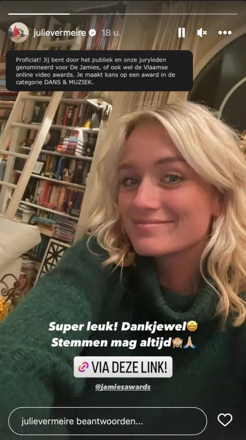 Jacques Vermeire is overduidelijk door het dolle heen. Op Instagram neemt ze even de tijd om iedereen uitgebreid te bedanken en natuurlijk ook om wat stemmen te ronselen. “Superleuk! Dankjewel”, schrijft ze dolenthousiast op haar verhaal. “Stemmen mag altijd!”